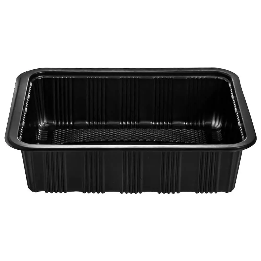 Microwave safe large sized black tray. Durable container with excellent structural rigidity designed to be used with film lids or clear lids.