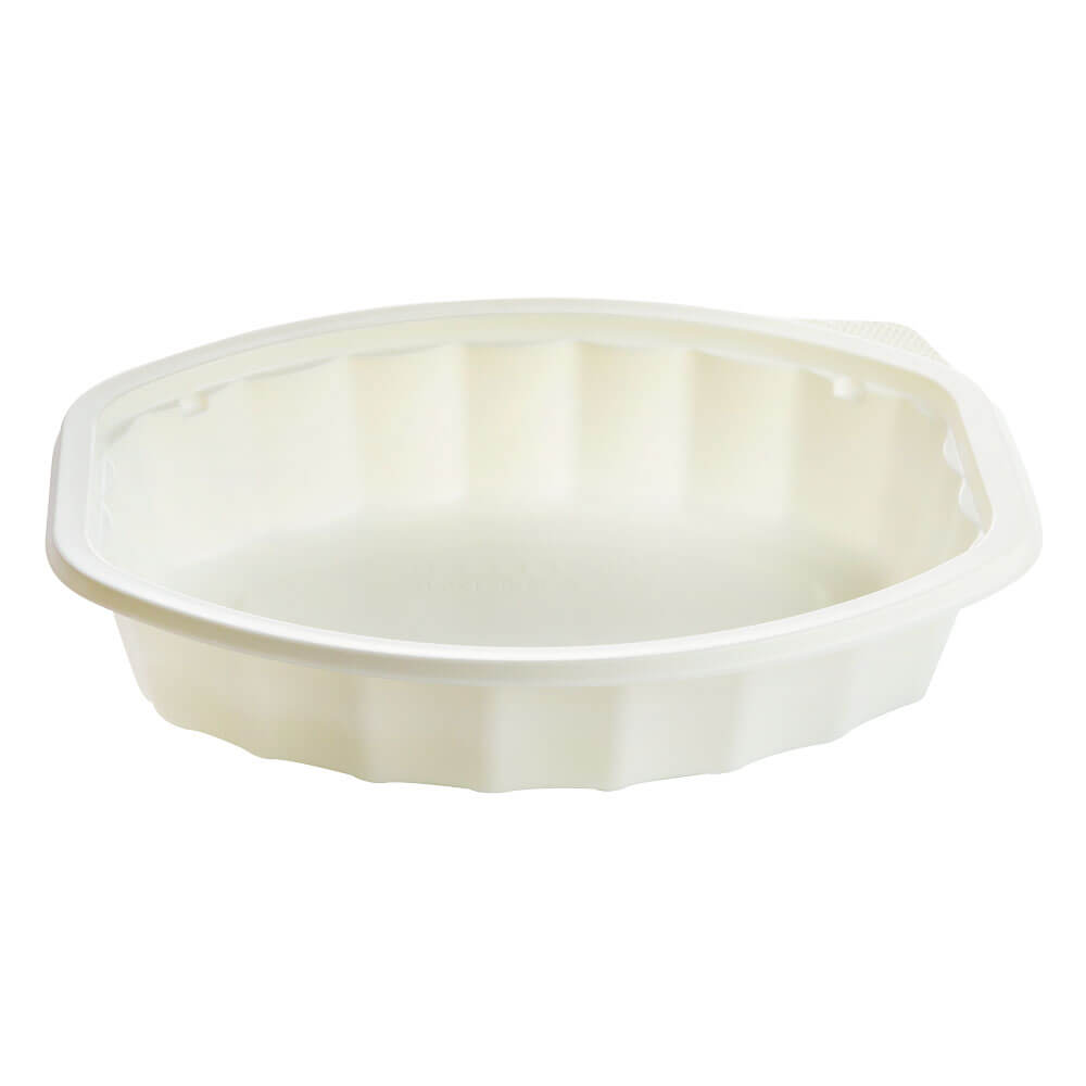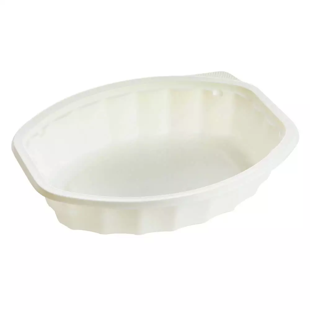 Microwave safe ivory colored oval bento box style bowl. Durable container with excellent structural rigidity designed to be used with film lids.