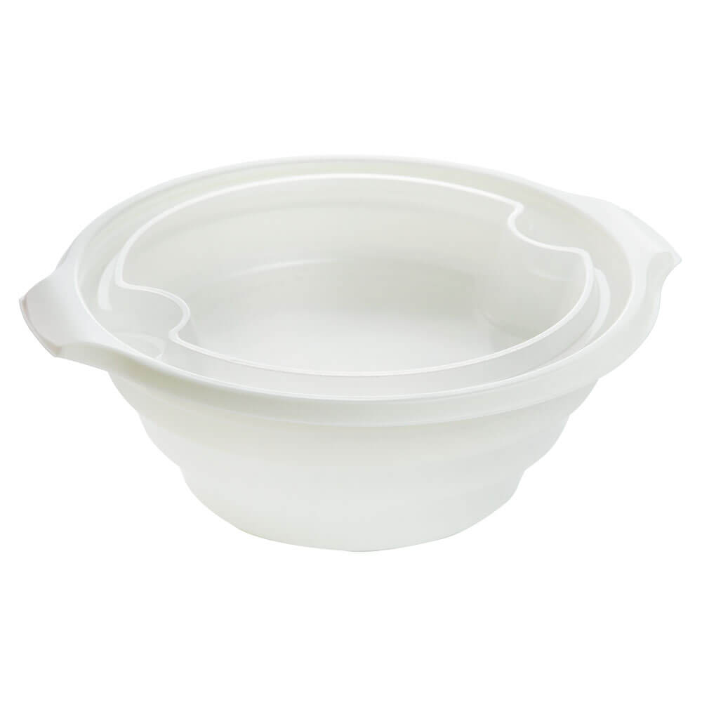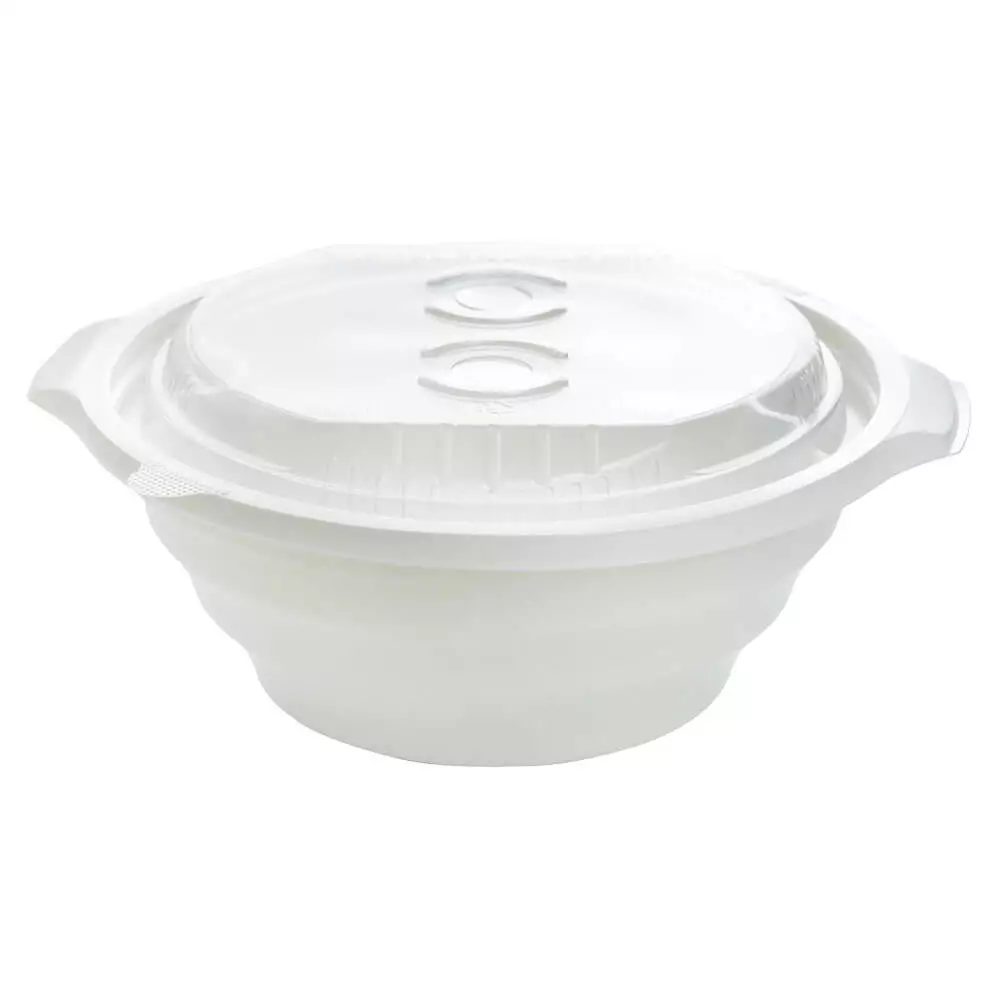 Microwave safe PP large capacity bowl with handles. Available with ultra clear or translucent lid for takeout and other hot foods. High quality and sturdy structural design with minimal material use.
