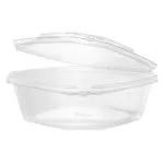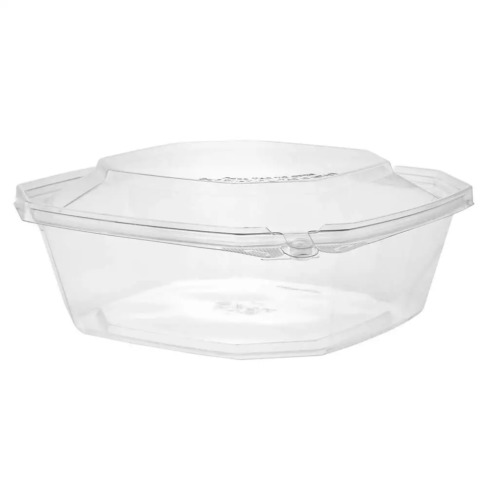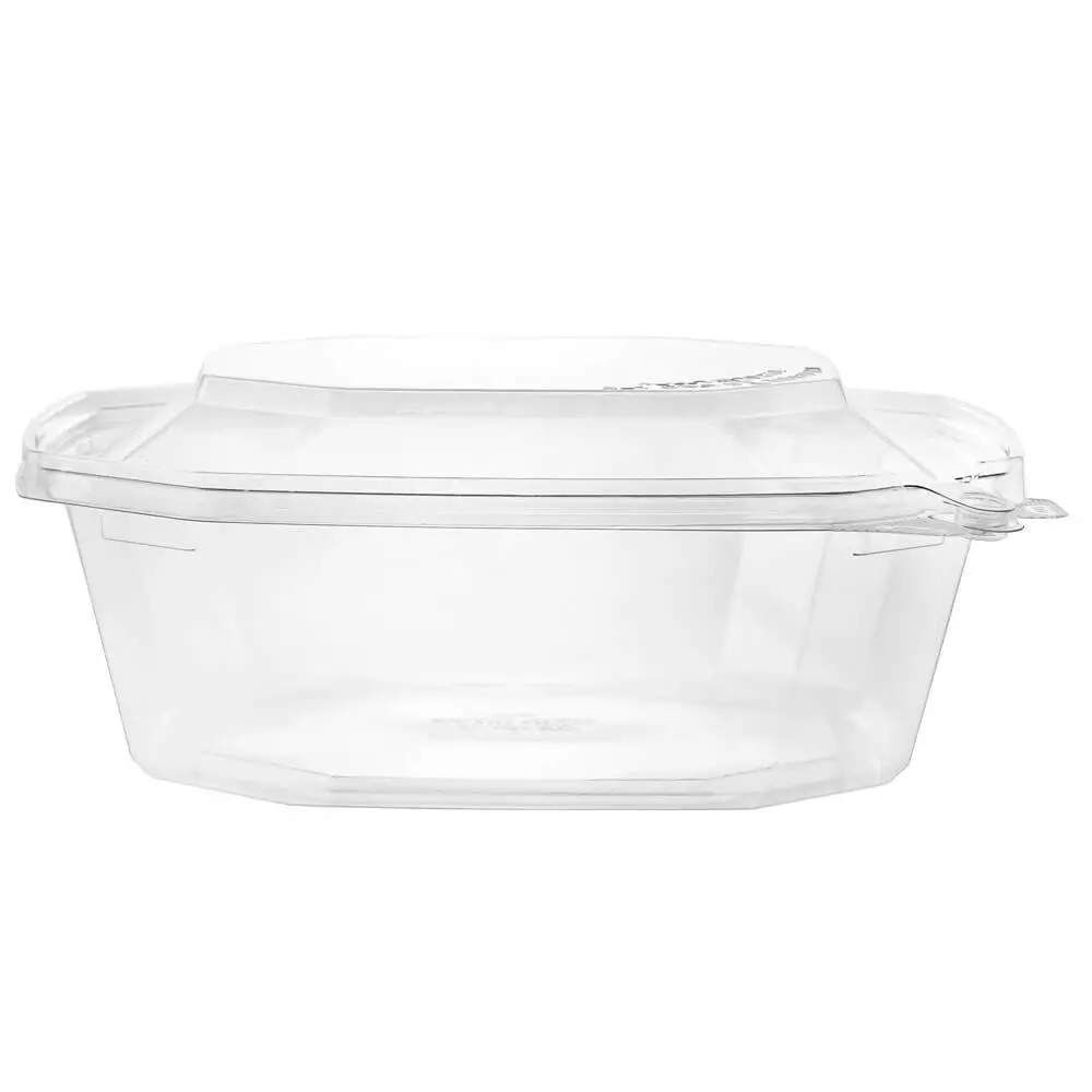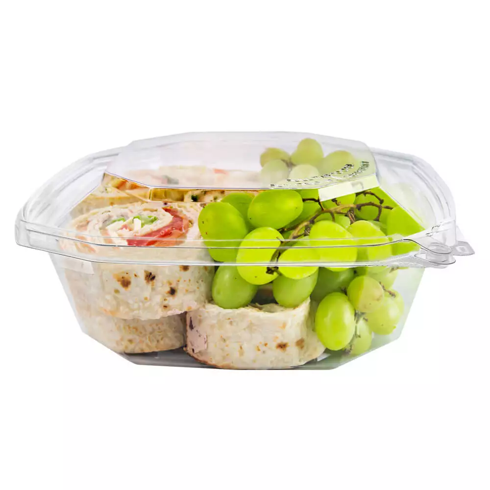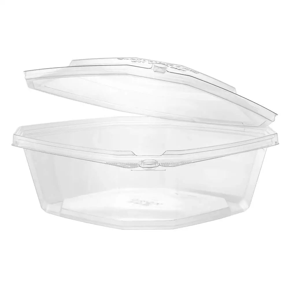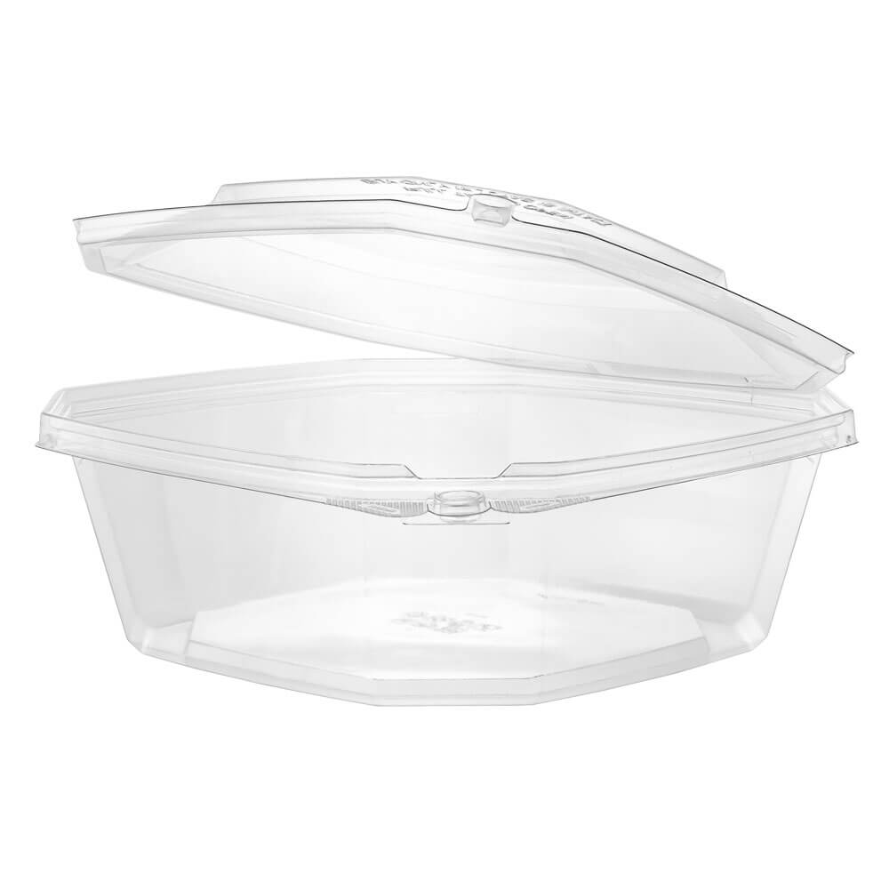 PCR Clear RPET octagonal shaped tamper evident container with no tear off strip. This uses our patented anti tamper design. Edges and high are all structurally reinforced for a sturdier product that closes securely. Material saving minimal stacking design to save space and cost during transportation and storage.