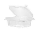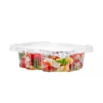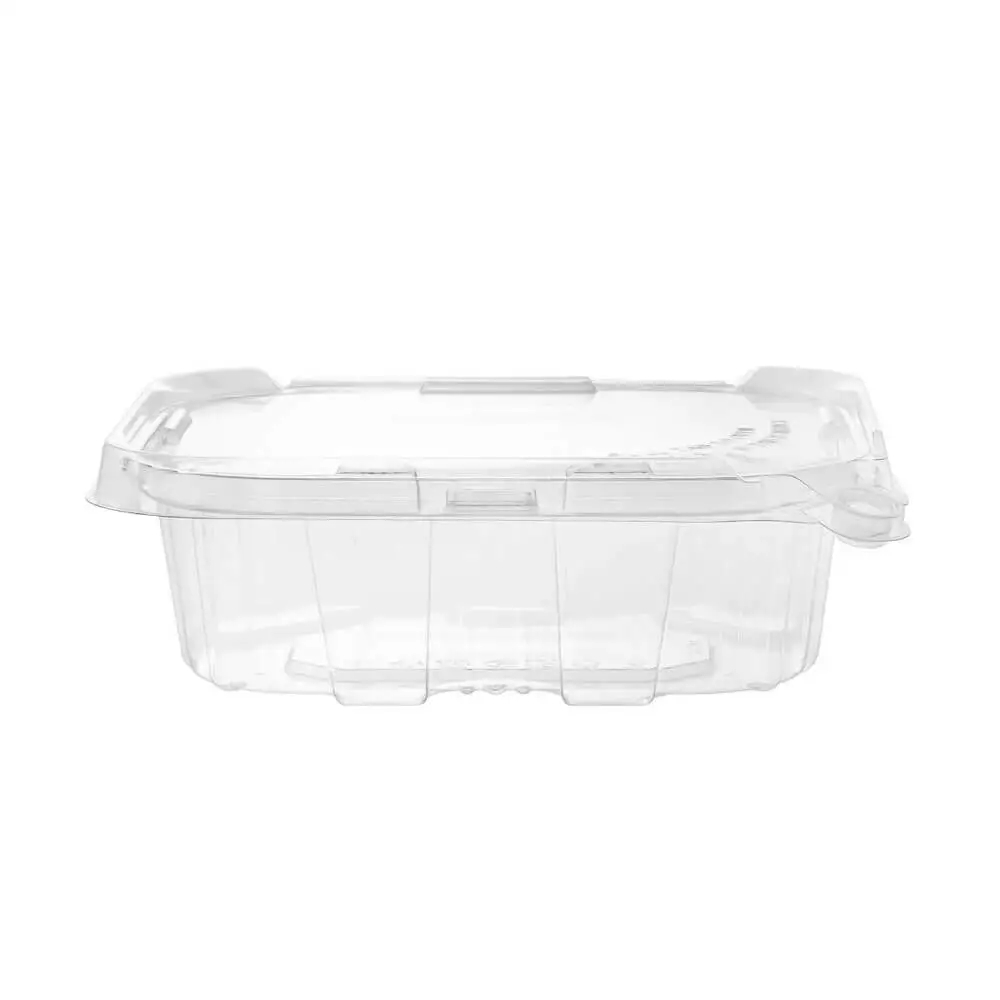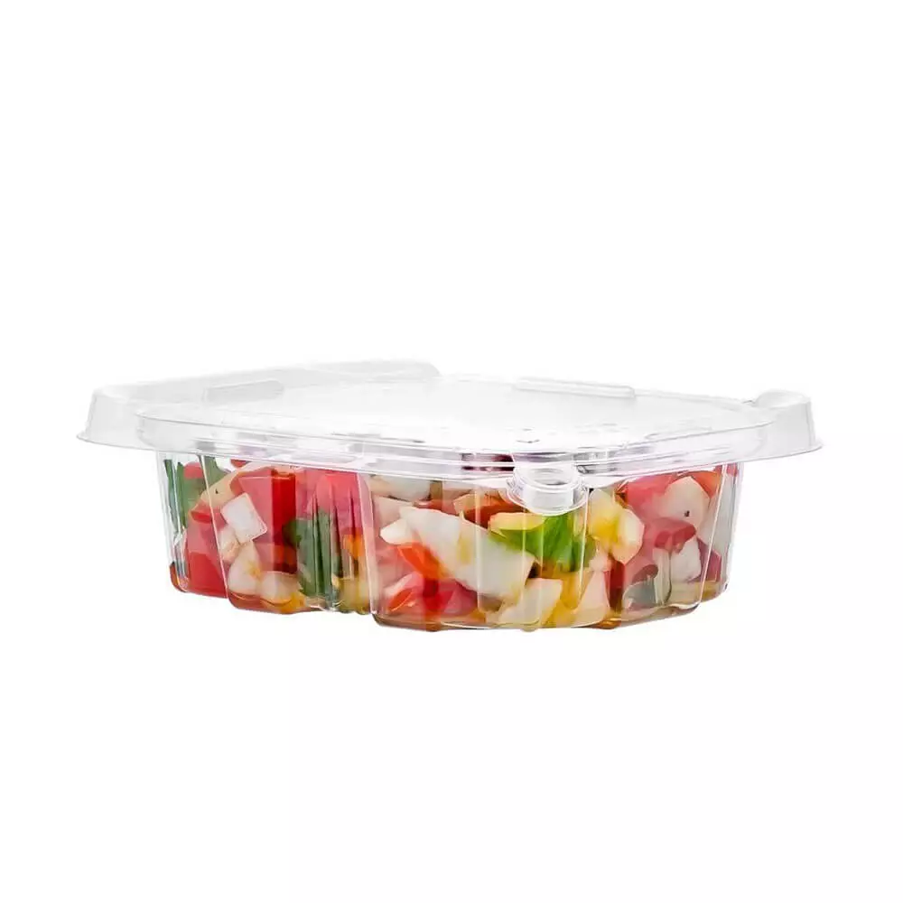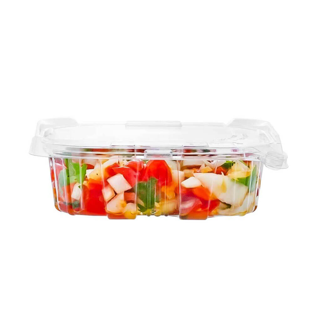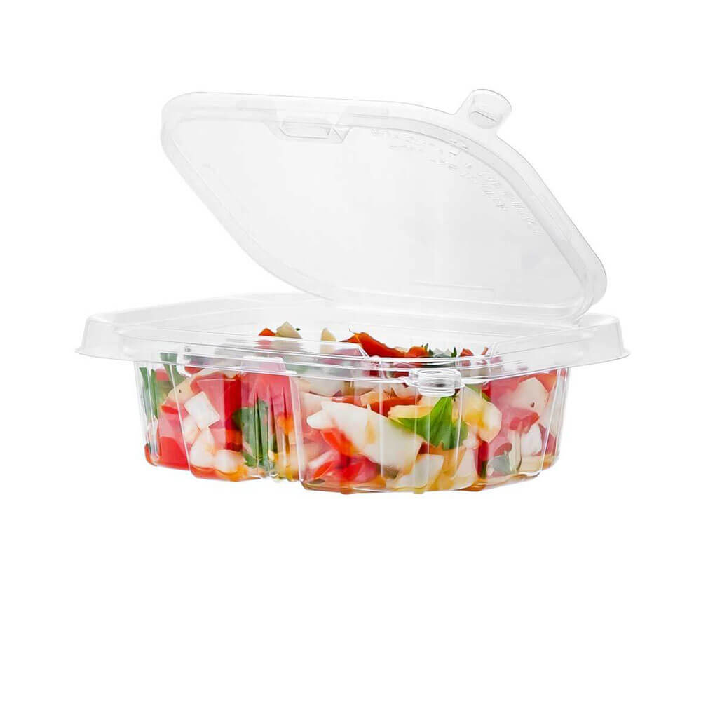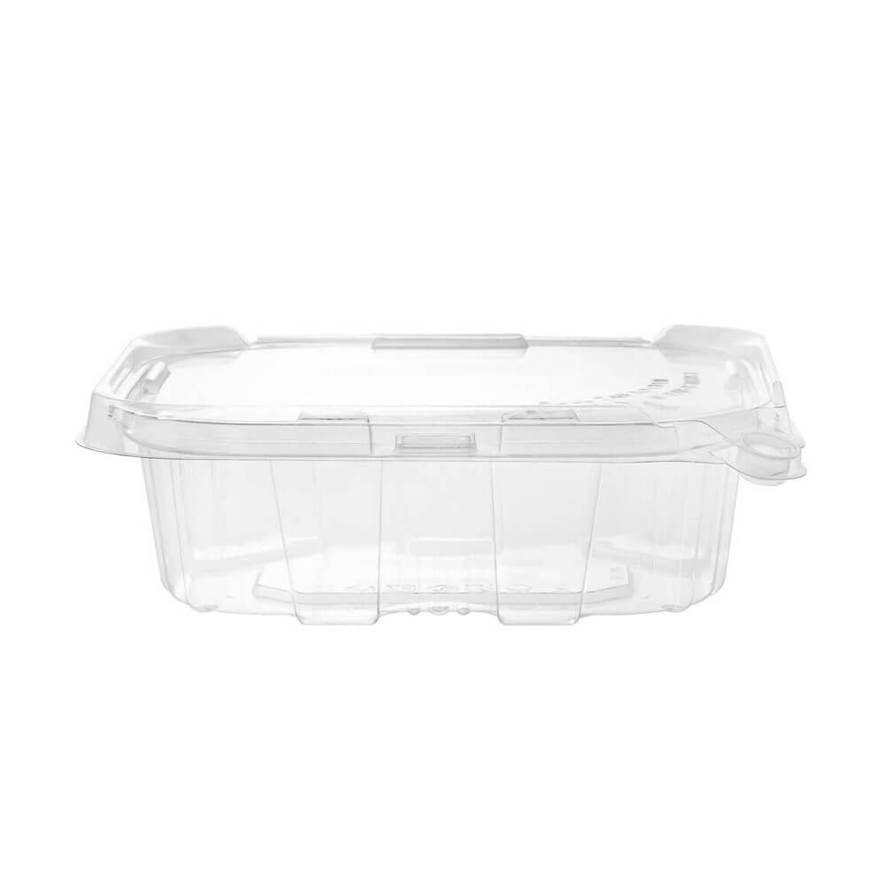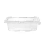 PCR Clear RPET Rectangular tamper evident container with no tear off strip. This uses our patented anti tamper design. Easy to seal and uses a special minimal stacking design for space saving in transportation and storage. Features excellent structural strength with minimal material usage.