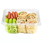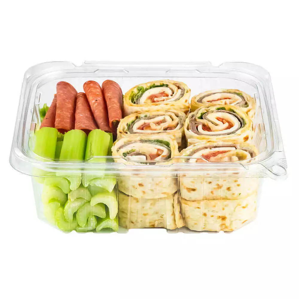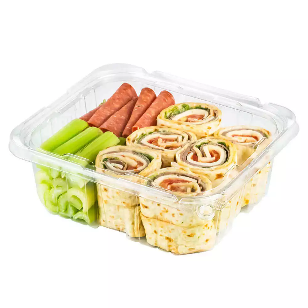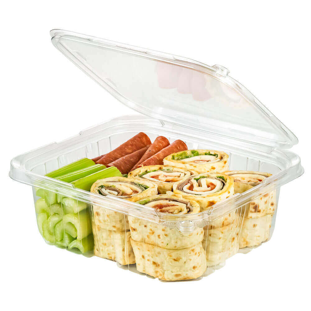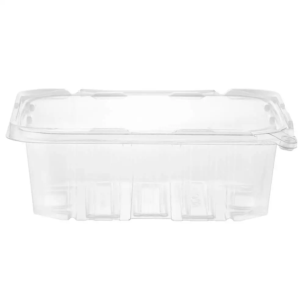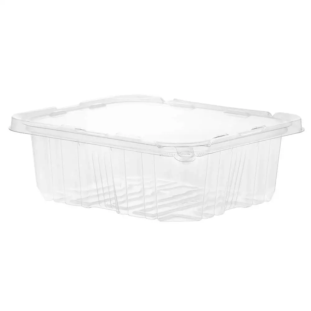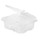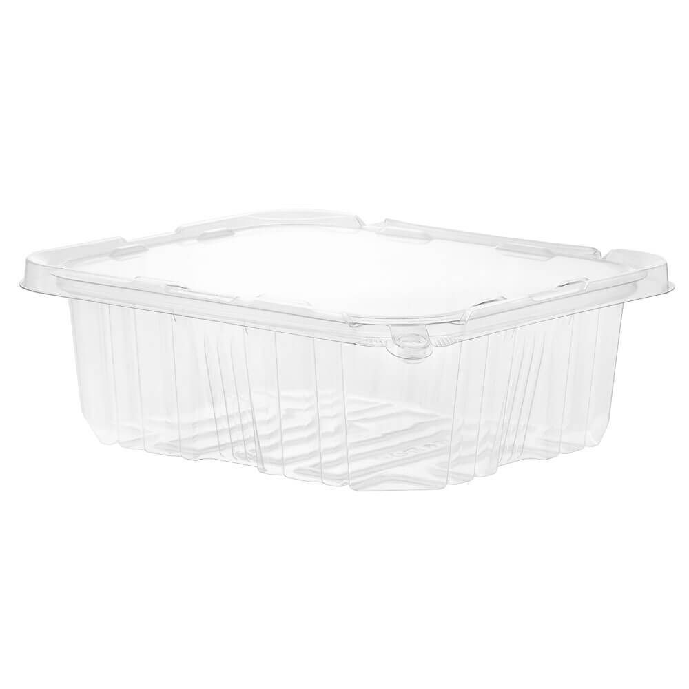 PCR Clear RPET Rectangular tamper evident container with no tear off strip. This uses our patented anti tamper design. Easy to seal and uses a special minimal stacking design for space saving in transportation and storage. Features excellent structural strength with minimal material usage.