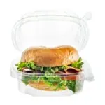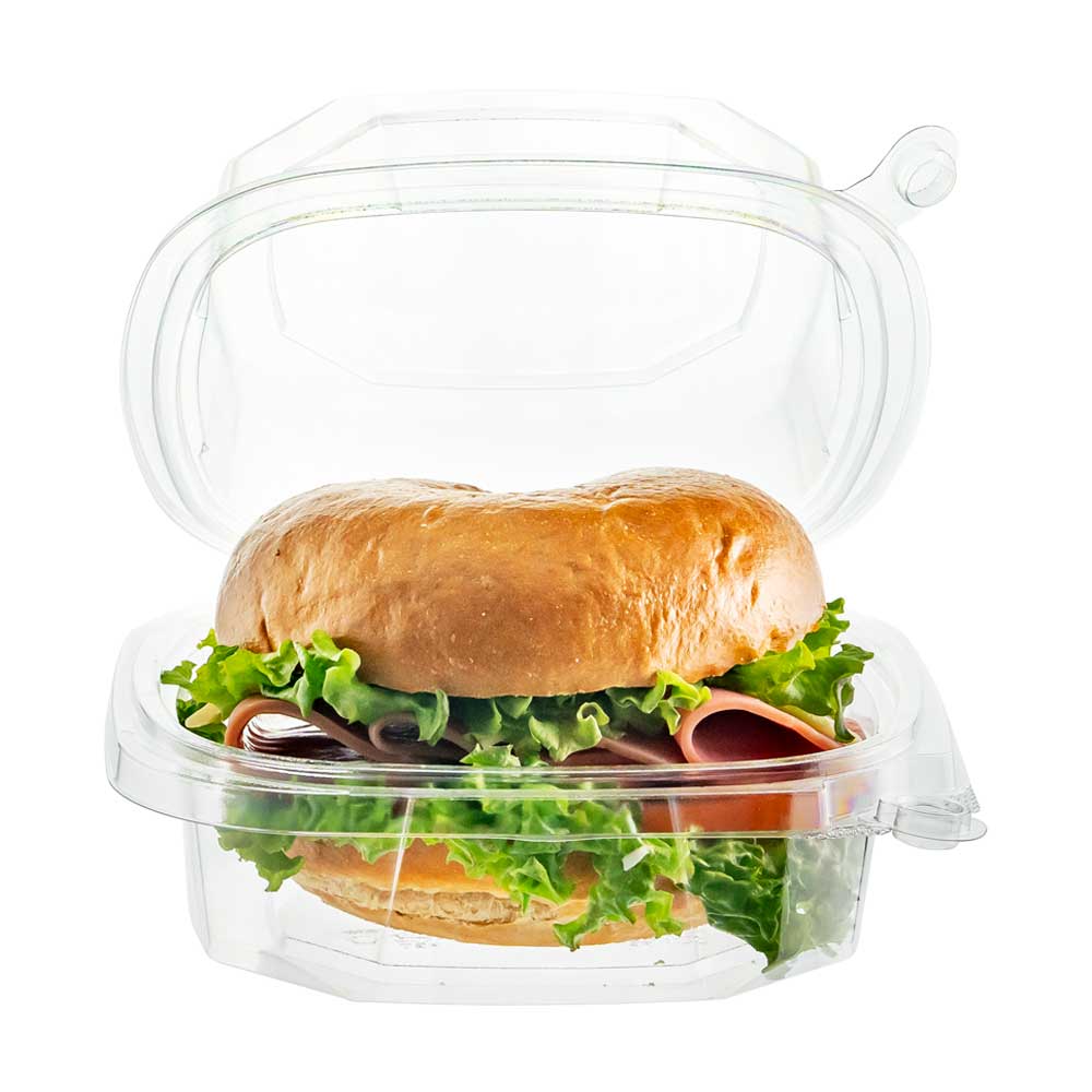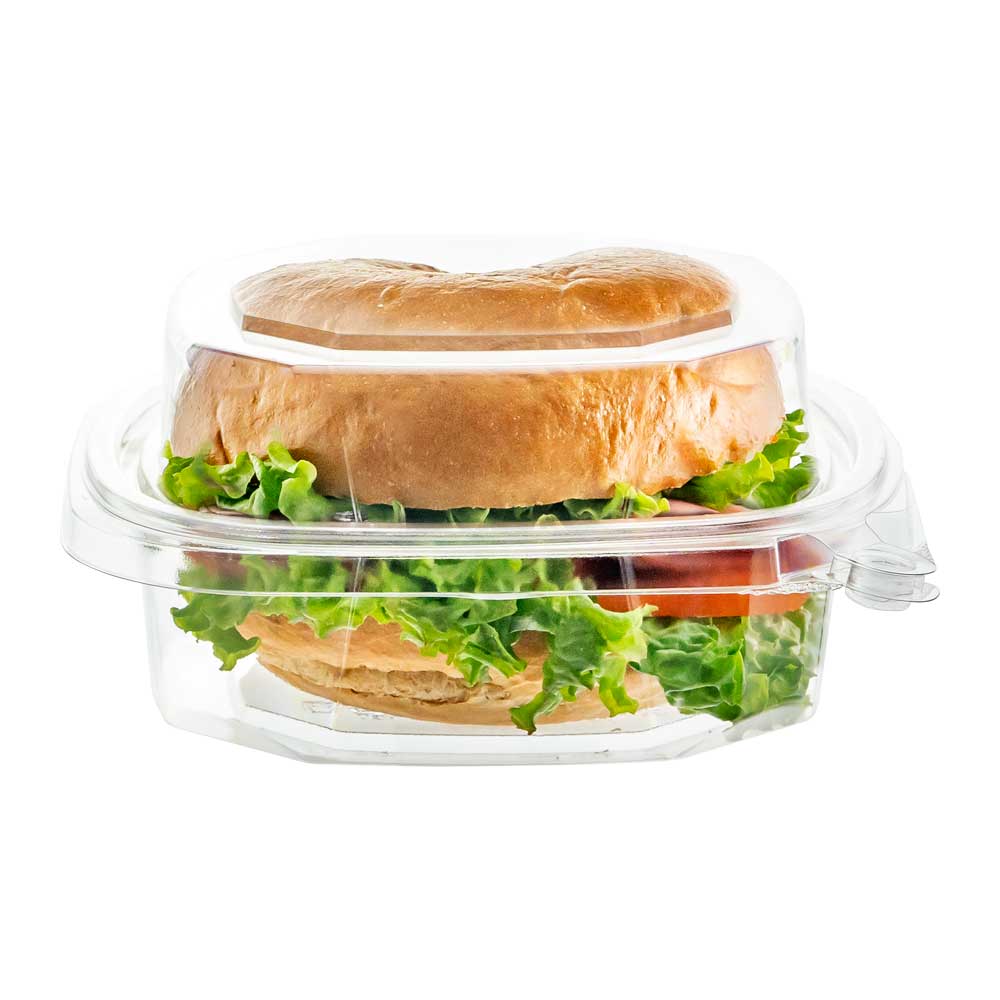 Clear recycled PET square container with patented tamper-evident design, no tear-off strip needed. Easy to seal, space-saving minimal stacking design, and excellent strength with reduced material usage.
