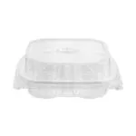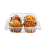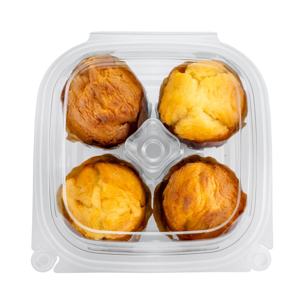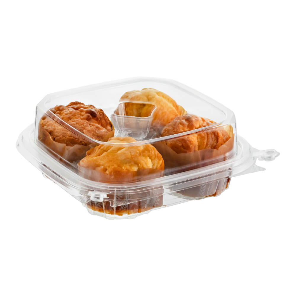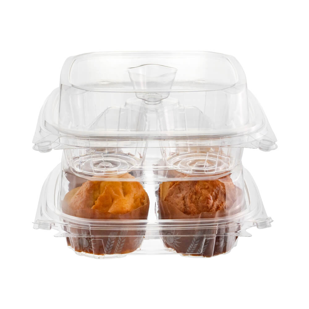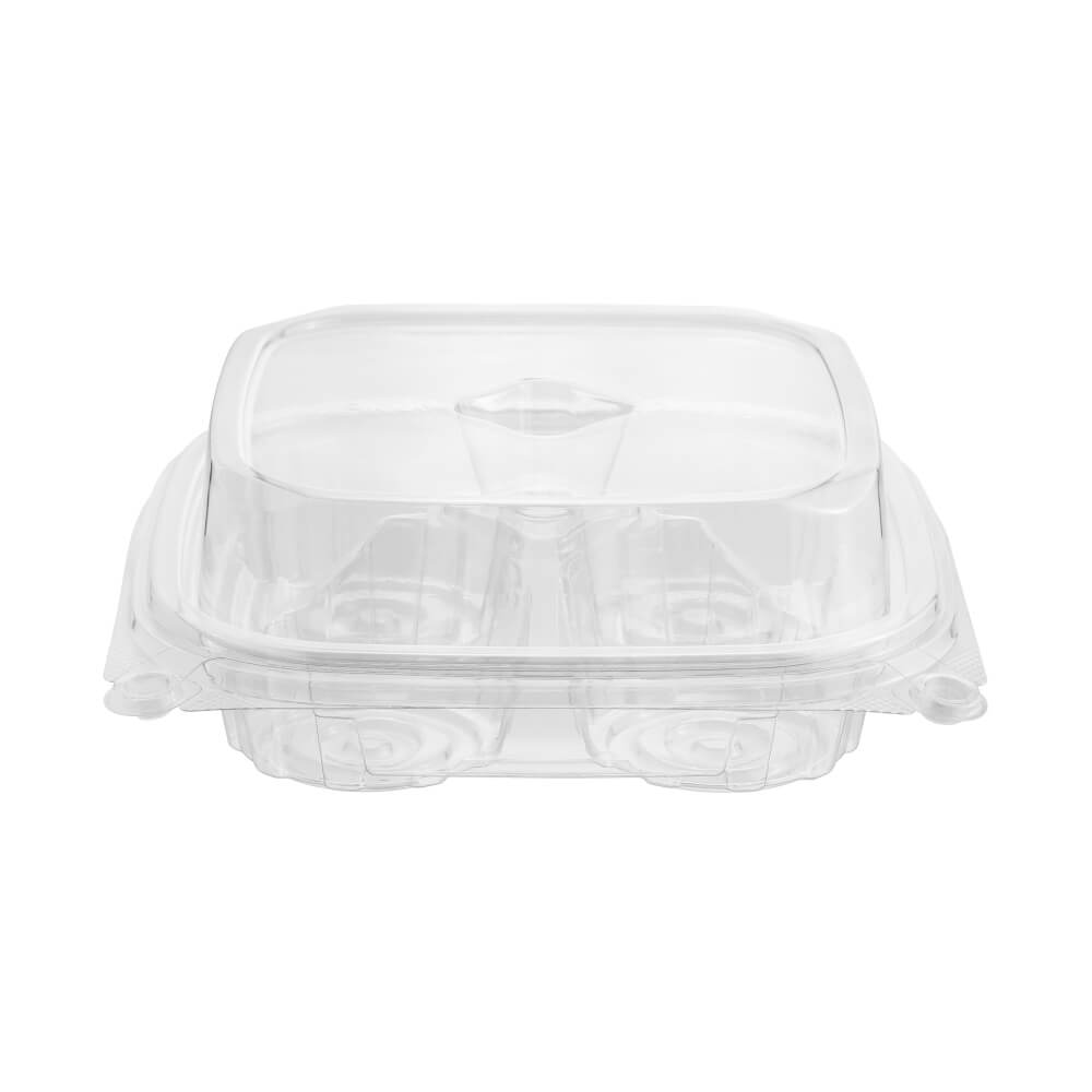 PCR Clear RPET 8" Tamper-Evident 4-Compartment Muffin Container. This lightweight and durable box is perfect for any occasion, from family gatherings to outdoor events. It's versatile enough to hold muffins and other small desserts, offering practical and wide applicability.